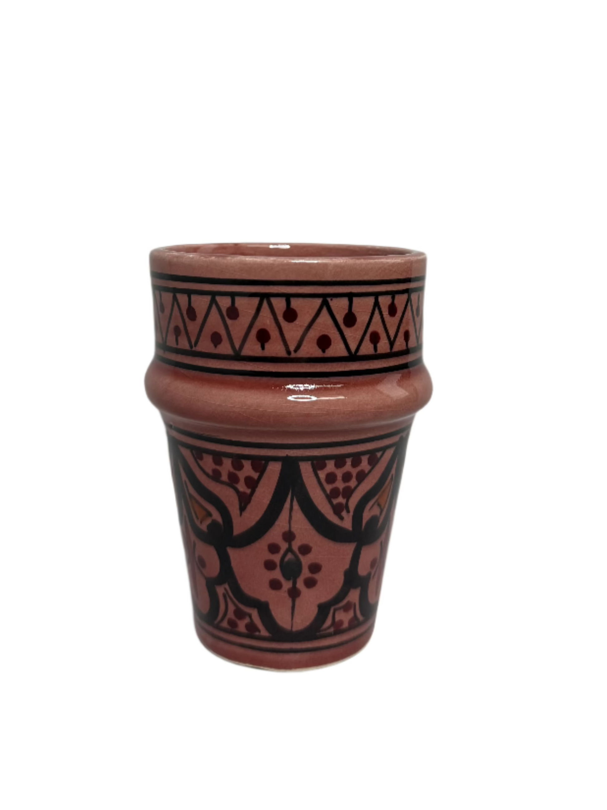 Hand-crafted and hand-painted in Safi, Morocco, this Beldi cup highlights timeless Moroccan design. Measuring 4 ¼" high x 3" in diameter, it pairs beautifully with our black-and-white plates or colorful dinnerware to create an eclectic, layered table setting. We recommend hand washing to preserve its finish.